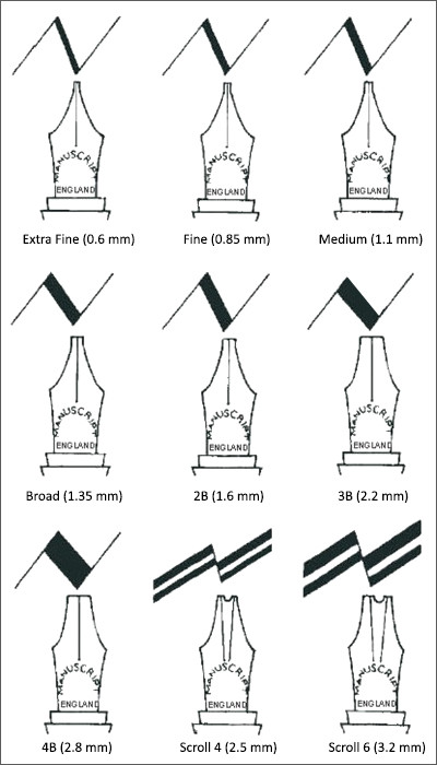 У Manuscript в серии перьев Roundhand Leonardt у нас есть перья - DP238BR - 0.5 мм, DP237BR - 0.75 мм, DP236BR - 1.0 мм, DP235BR - 1.1 мм, DP234BR - 1.4 мм, DP233BR - 1.6 мм, DP232BR - 2.0 мм, DP231BR - 2.5 мм, DP230BR - 3.0 мм и DP2300BR - 4.0 мм.